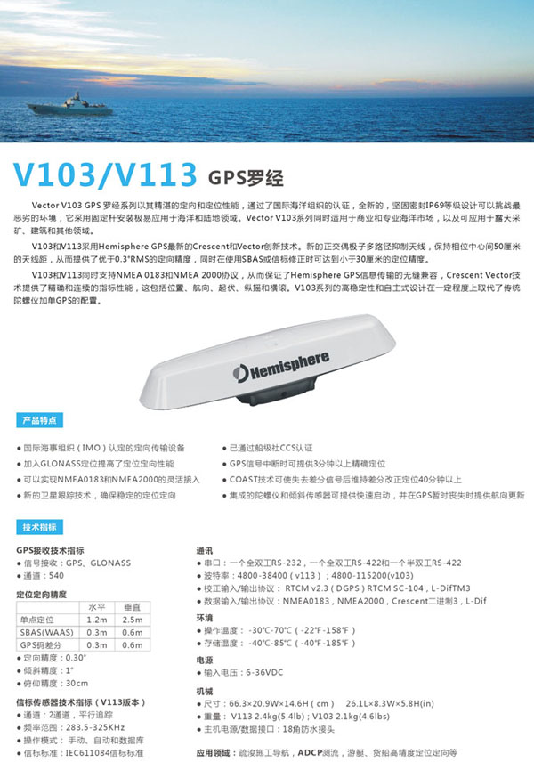 【南方衛(wèi)星導(dǎo)航 黃天進】日前,南方衛(wèi)星導(dǎo)航獲得合眾思壯旗下Hemisphere公司水上應(yīng)用產(chǎn)品的中國總代理權(quán),將全部負責Hemisphere公司在中國大陸的雙星(GPS+GLO)一體定向儀、分體定向儀、信標機的銷售渠道及售后服務(wù),代理產(chǎn)品型號包括一體機V102、V103、V113和分體機R330、VS330和VS131等。