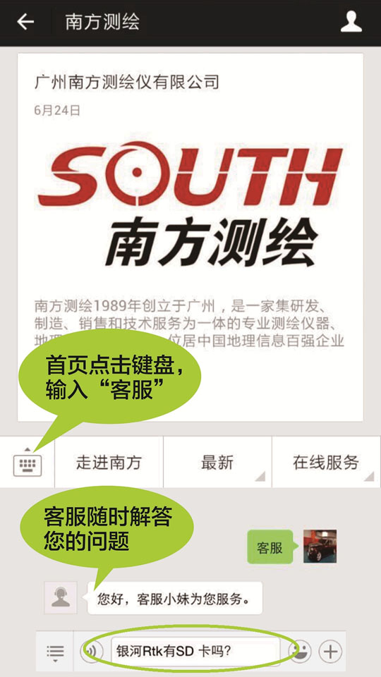 南方測(cè)繪微信客服上線一個(gè)多月來(lái),為用戶在微信上開(kāi)辟了一條快捷解決訴求的通道。每天8:30-18:00期間,用戶可以發(fā)送文字、圖片、語(yǔ)音等多媒體信息給客服,咨詢產(chǎn)品信息、技術(shù)問(wèn)題,尋求售前和售后幫助,還可以提意見(jiàn)和建議等等。