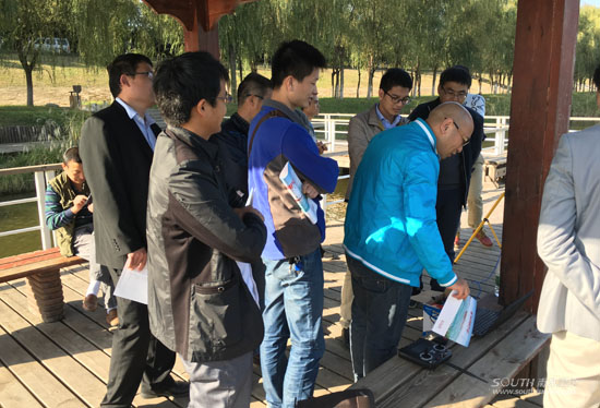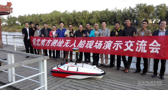湖北為千湖之省,無人船應用市場很廣,客戶對南方智能測量無人船表示了極大的興趣。該無人船集成度高,它將傳感器、智能控制導航、無線通訊、高精度衛星導航(支持北斗)、聲吶探測等眾多技術相,能自動、精確、 地開展水深測量、庫容勘測、水文測驗、疏浚檢測等各種任務。 由于無人船集成度高,可攜帶多種傳感器,進行各種行業的定制性加載,不同單位客戶與技術人員展開了討論交流,提出了很多建設性意見。武漢分公司羅君與長江航道局領導就增強無人船的定制化需求進行了探討。 演示交流會合影