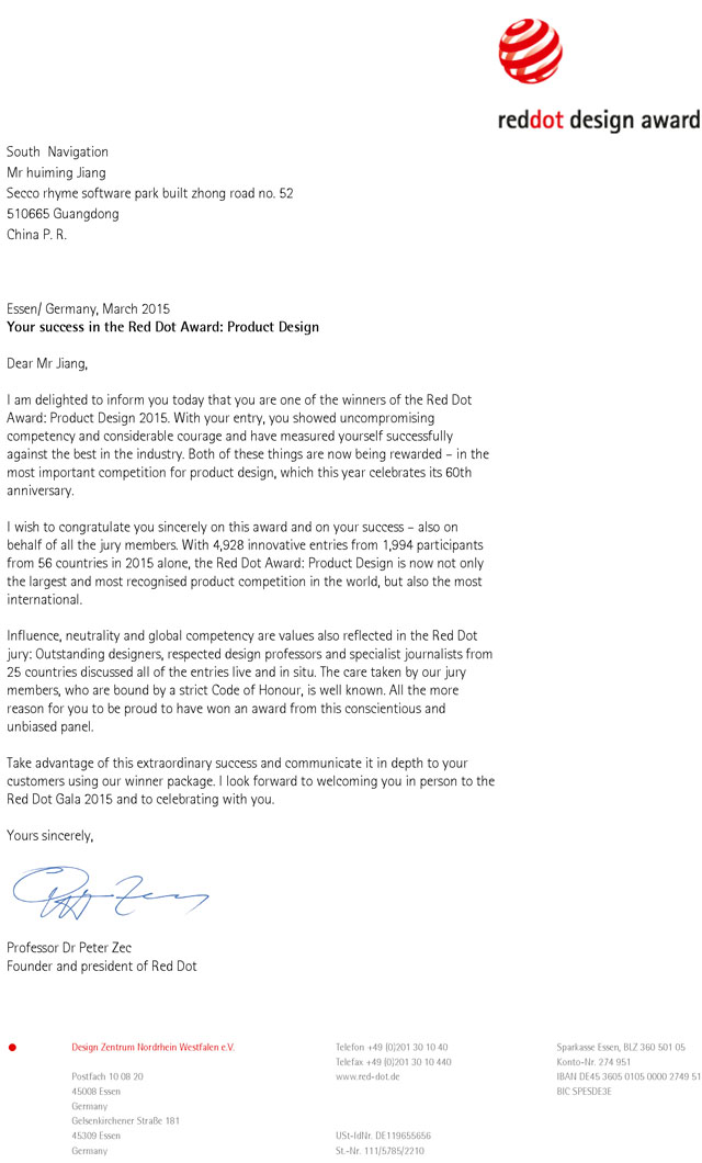 獲獎證書: 銀河1的研發設計者們不僅巧妙地將產品體積濃縮到史上小,還憑借著豐富的產品研發設計經驗和過硬的技術基礎,成功規避和解決了體積濃縮過程出現的各種問題,如通過防松動內部止鎖設計、防摔壞外部傾角設計、全方位防護設計、科學散熱設計等提升產品抗摔、抗震、散熱能力;通過多層屏蔽技術解決電磁串擾等問題,大大提升產品質量和使用性能。 體積小了,但銀河1的功能卻更強大了。傾斜測量、電子氣泡、NFC藍牙觸配、雙模長距離藍牙、全星座、云服務、內置電臺、便捷配套……將會給用戶帶來的測量體驗。 銀河1正是南方應對新形勢下測繪地理信息行業發展的一項創新之舉,南方衛星導航始終行業潮流。銀河1憑借其突出的設計理念,精湛的制作工藝以及豐富強大的產品性能榮獲大獎,再次證明了南方衛星導航研發設計團隊過硬的技術實力以及公司作為行業領頭羊的實力。 關于紅點設計大獎: 紅點設計大獎是由德國設計協會Design Zentrum Nordrhein Westfalen創立,到今恰有60年歷史,是公認的全球工業設計獎項之一,也是世界三大設計大獎之一。紅點獎評選的標準極為苛刻,獲得該獎意味著產品外觀及質感獲得了具的“品質保證”。