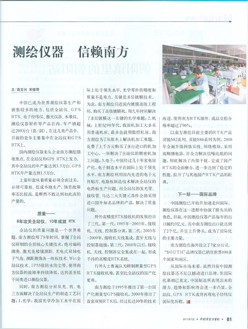 【品牌與宣傳企劃中心】近日,《中國質(zhì)量萬里行》走進(jìn)南方測繪,以《測繪儀器信賴南方》為題報道了南方(已刊登于《中國質(zhì)量萬里行》2011年7月刊)。