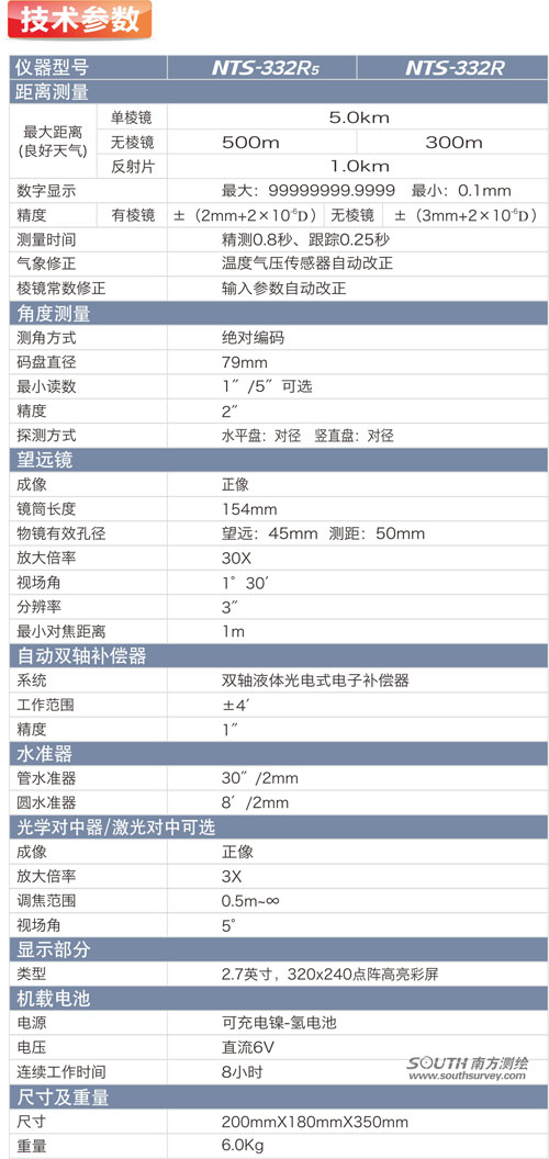 南方NTS-332系列全站儀采用激光測(cè)距、編碼及雙軸補(bǔ)償?shù)刃录夹g(shù),極大降低故障率,提高測(cè)量作業(yè)效率。對(duì)所有的相關(guān)零件都進(jìn)行了重新