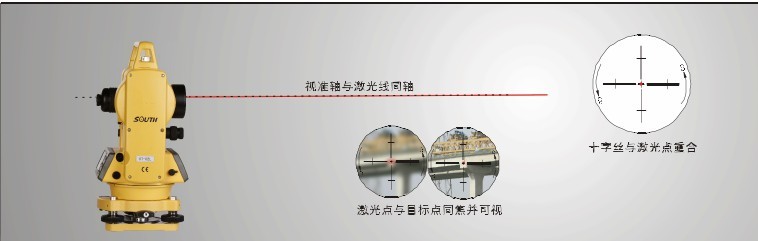 南方同軸可視激光電子經緯儀,采用的激光線與視準軸同軸、同焦、可視技術,十字絲中心點導激光點重合,實現所見即所測,簡化了測量步驟,大大提高了測量效率。大屏幕、全中文顯示、按鍵簡潔、操作方便,良好的防水防塵性能。也可向天頂方向垂直發射激光束,作一臺激光垂準儀使用。若配置彎管讀數目鏡,則可根據豎盤讀數對垂直角進行測量。當望遠鏡照準軸精細調成水平后,又可作激光水準儀及激光掃平儀用。